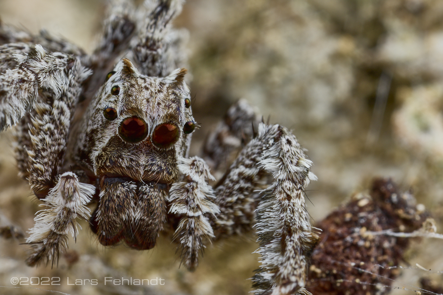 This type of jumping spider is very well camouflaged and often sits motionless next to some lichen on the rock. The genus Portia is known to specialise in hunting other spiders, often waiting at the edge of their prey’s webs.